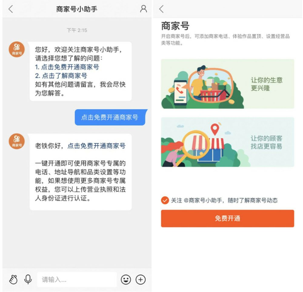 2、先关注 再发私信 回复【开通商家号】点击回复的