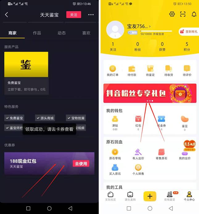 2、会在消息处获得一个券码--领取后下载打开天天鉴宝app--个人中心--中间滚动图“抖音粉丝专属福利”进去