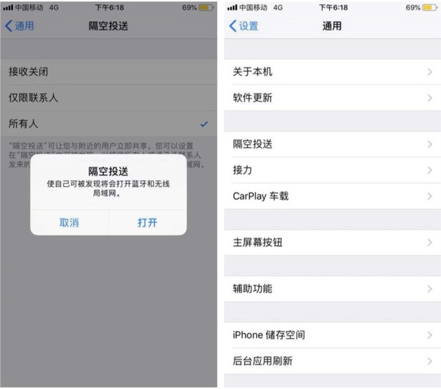 在苹果设备上面,点击【设置】进入里面,然后依次打开【通用】—【隔空投送】—选择【所有人】,这里注意,定位服务功能要开启。隔空投送照片、打开相册、点击分享按钮,选择所连接到设备,点击隔开投送,之后从另一部设备上面点击接收按钮即可。