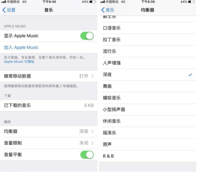 这个时候你可以试试iPhone里的深夜模式,相信我会有意外惊喜的。具体方法是依次打开【设置】、【音乐】、【均衡器】、最后选中【深夜模式】。笔者亲试,音量相比没有打开前放大了很多。