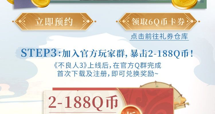 不良人3预约入群领8-188QB券 游戏上线后兑换,预约领6QB卡券,加群领2-188QB卡券,游戏上线后兑换QB。
