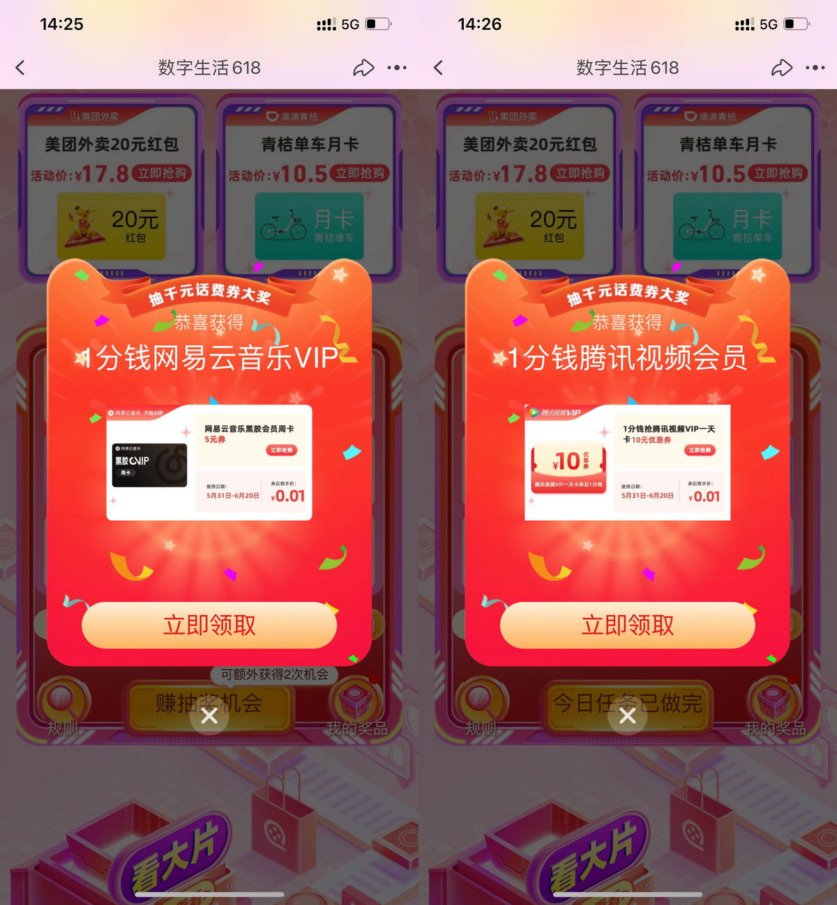 手机淘宝APP扫码->一共4次机会用完->只有抽中网易云或腾讯视频才有用->填写手机号下单秒到