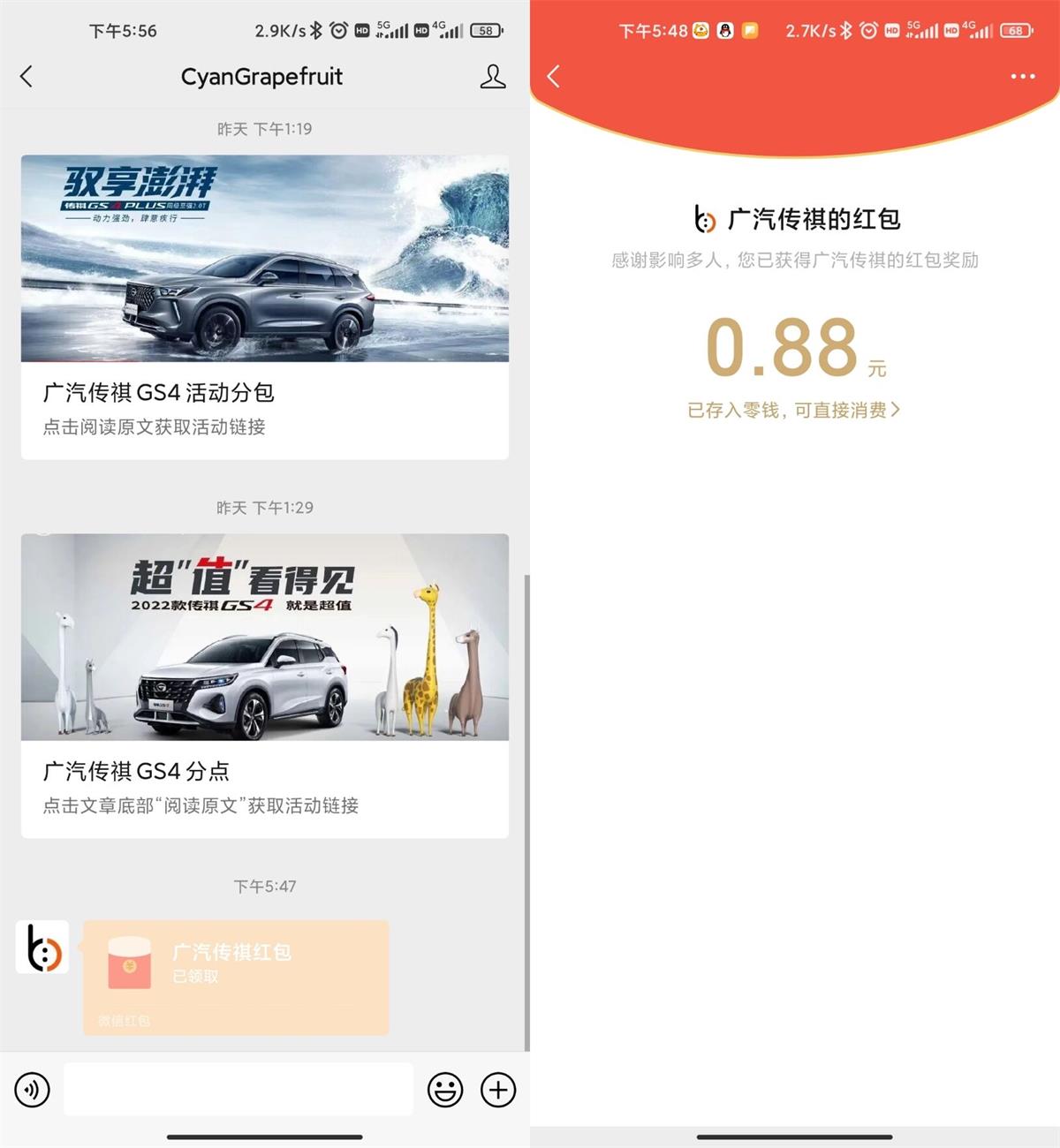 微信关注公众号“CyanGrapefruit”->打开活动地址->分享给小号->小号点击进入->自动推送红包给大号