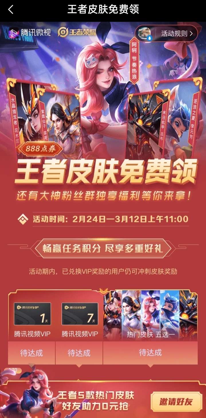 王者荣耀史诗活动期间在微视免费领取热门史诗皮肤五选一活动时间在2.24~3.12前11点完成任务即可以领取热门皮肤五选一