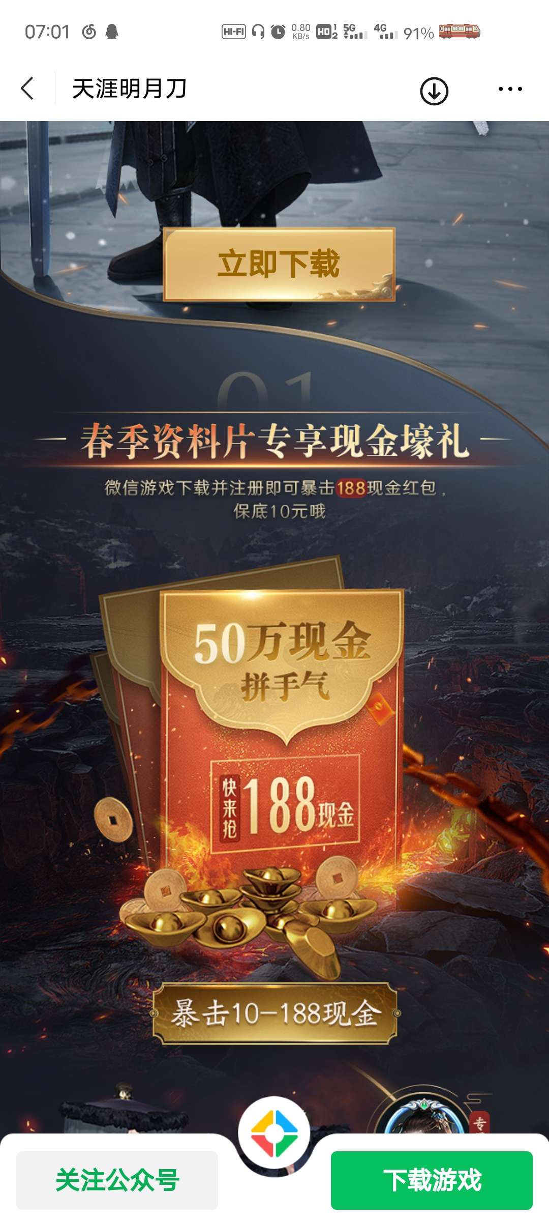 【活动规则】活动期间,玩家通过微信游戏下载注册并首次授权登录游戏即可抽现金红包一次,保底可得10元,现金数量有限,先到先得;