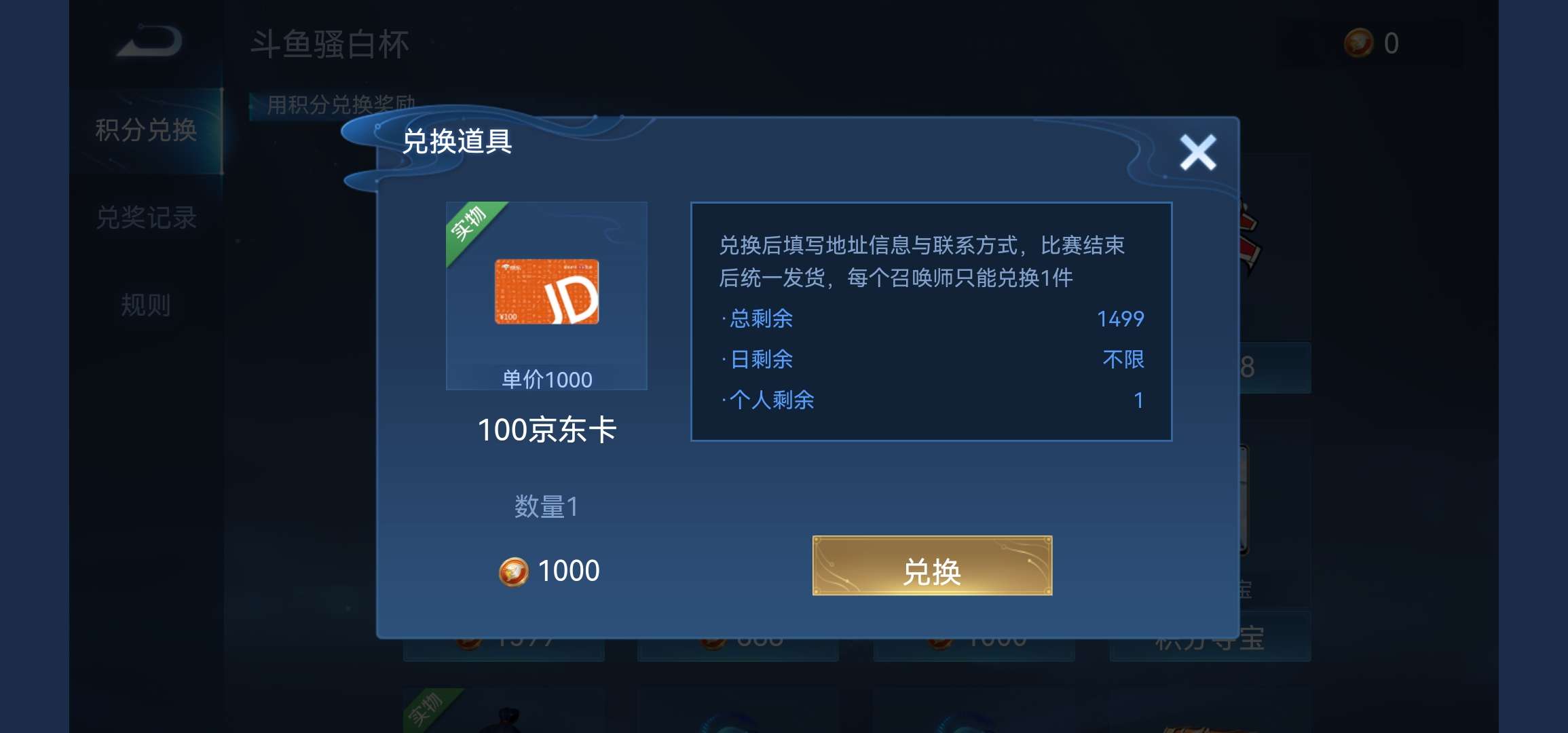 王者荣耀骚白杯换取100京东卡