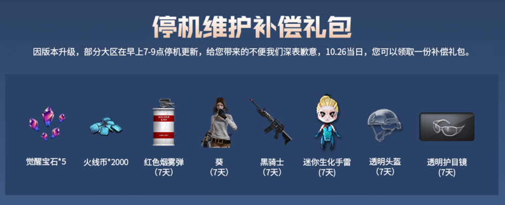 停机维护补偿礼包内容:5个觉醒宝石、2000火线币、红色烟雾弹7天、葵7天、黑骑士7天、迷你生化手雷7天、透明头盔7天、透明护目镜7天。
