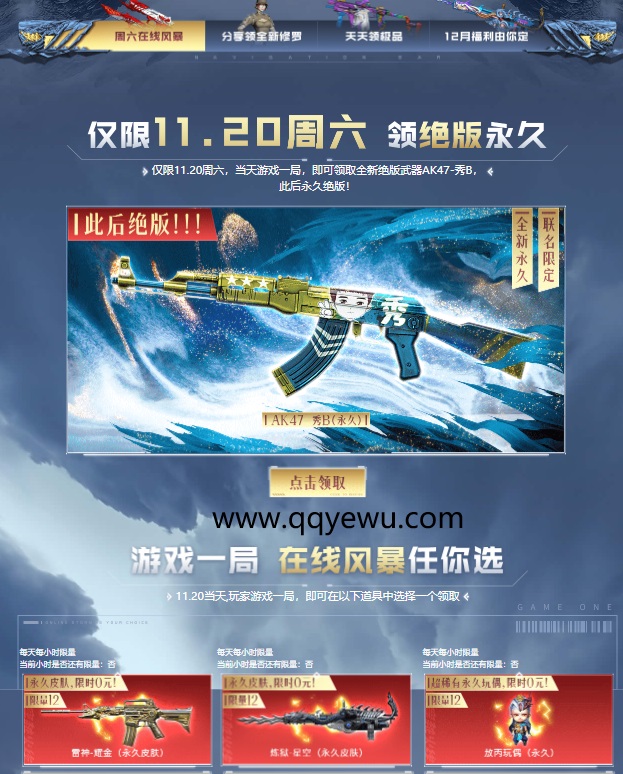 CF11.20周六全新绝版免费领,有AK47秀B,修罗年鹏,还有很多其他武器,都可以去参加一波。