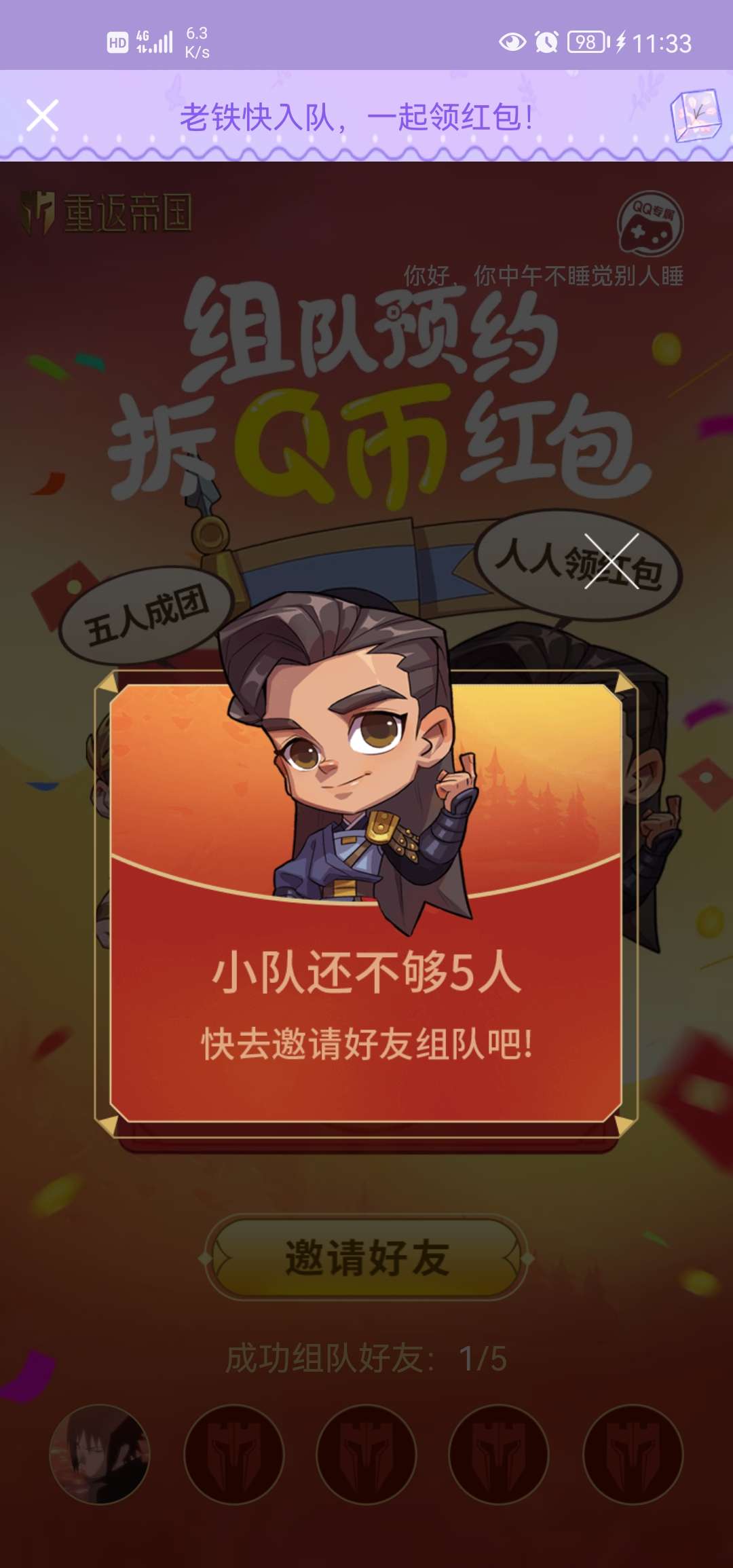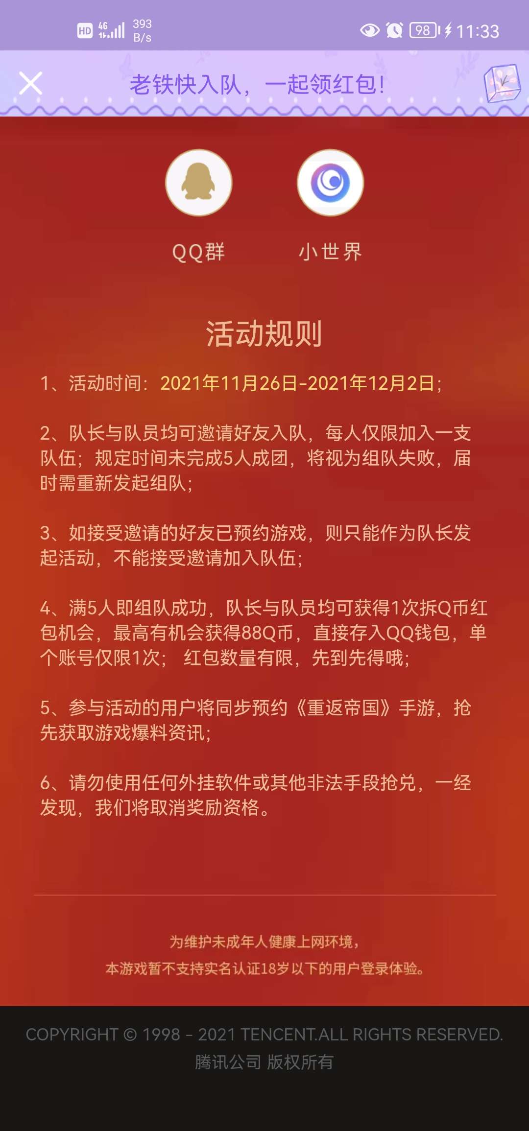 【活动介绍】重返帝国组队五人最高获取88Q币