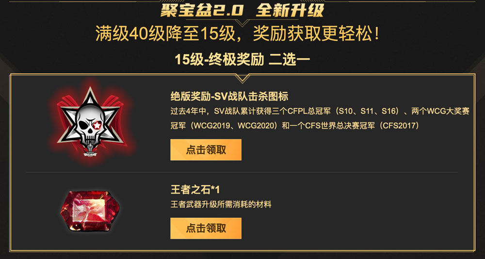 CF12月聚宝盆活动,满级40级降至15级,奖励获取更轻松,绝版SV战队击杀图标、王者之石,还有斗鱼虎牙等武器。