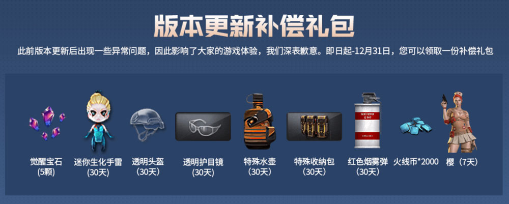 在活动期间,玩家可以在活动页面中无条件领取版本更新补偿礼包。礼包包括5颗觉醒宝石、迷你生化手雷(30天)、透明头盔(30天)、2000火线币等奖励。