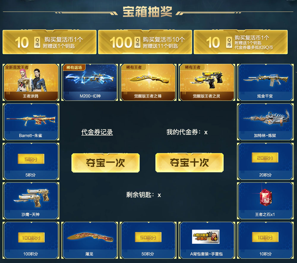 CF1月幻神夺宝活动2022,玩家购买复活币可赠送钥匙,使用钥匙可以在奖池中进行抽奖,即有机会抽到王者涂鸦、M200-幻神、觉醒版王者之锋、觉醒版王者之灵等奖励,玩家在奖池中抽到的积分,还可以用来在兑换区兑换指定奖励。