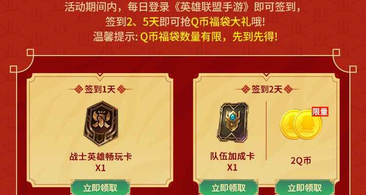 LOL手游暖心峡谷福利每天签到领7QB,签到2天领2QB 签到5天领5QB,一共7QB,还有游戏道具那些。