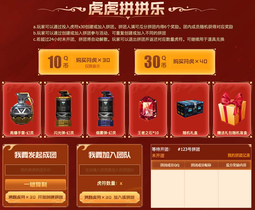 虎年拼拼乐:使用30符虎可拼团 6人满团,随机分6种奖励,拼团次数无上限: