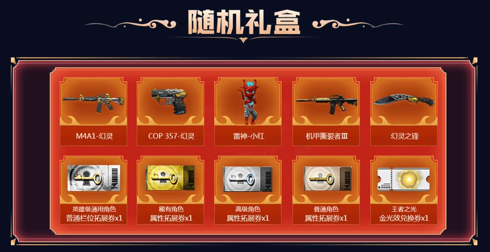 购买多套领额外奖励:幻灵之锋、 机甲撕裂者Ⅲ、 雷神-小红、 COP 357-幻灵、影豹、 M4A1-幻灵(激活套装效果)、 英雄级通用角色普通栏位拓展券x1+COP 357-幻灵