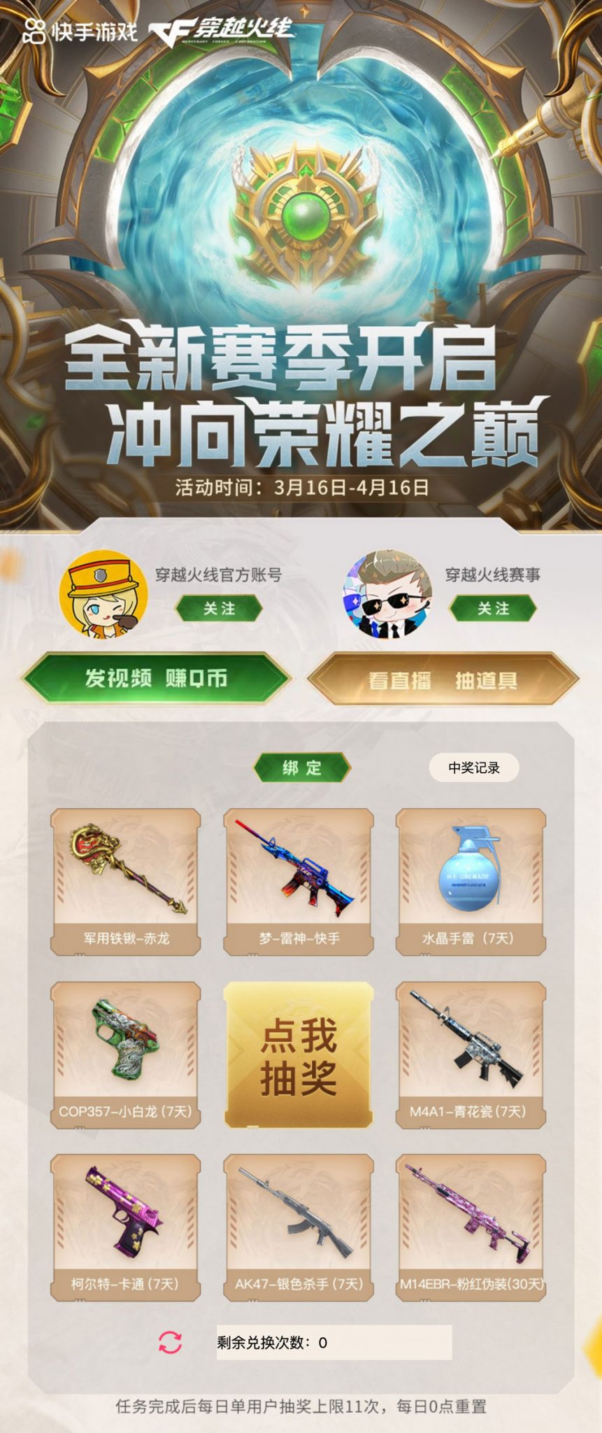 活动时间:2022年3月16日-4月16日 刚刚测试已可以抽奖了
