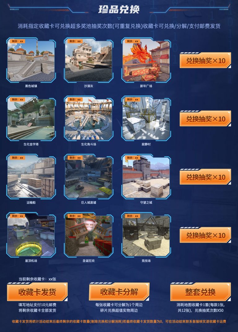 CF火线收藏馆,首套经典地图珍藏实体卡,可购买收藏或兑换为抽奖次数获得周边碎片兑换其他周边,实体卡发货需要填写地址并支付运费。