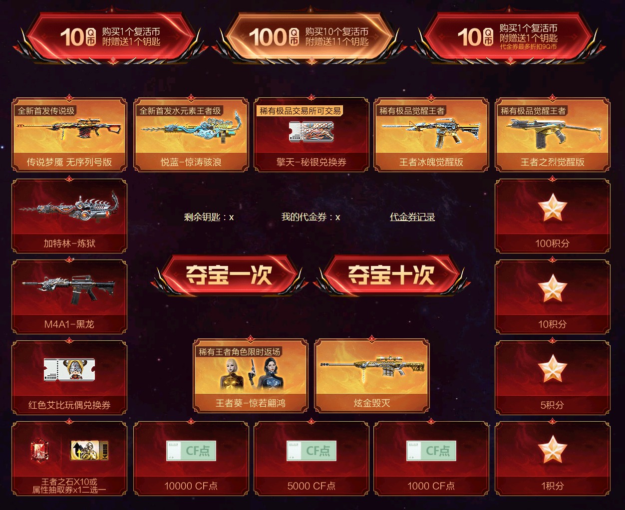 CF传说梦魇夺宝活动,玩家可获得传说梦魇(非序列号版)、悦蓝-惊涛骇浪(全新首发武器)、王者-葵-惊若翩鸿(限时返场)、100000CF点(积分兑换)、擎天-秘银兑换券(可交易)、红色艾比玩偶兑换券(可交易)、王者冰魄觉醒版、王者之烈觉醒版等奖励
