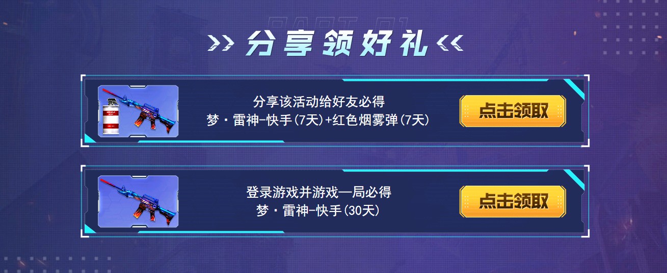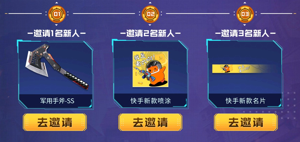 CF快手周年庆活动,游戏一局领梦·雷神-快手(30天)邀请人数最多的给M4A1猎神、邀请1名新人领军用手斧-SS、邀请2名新人领我是老六啊喷图、邀请3名新人领我是老六啊名片。