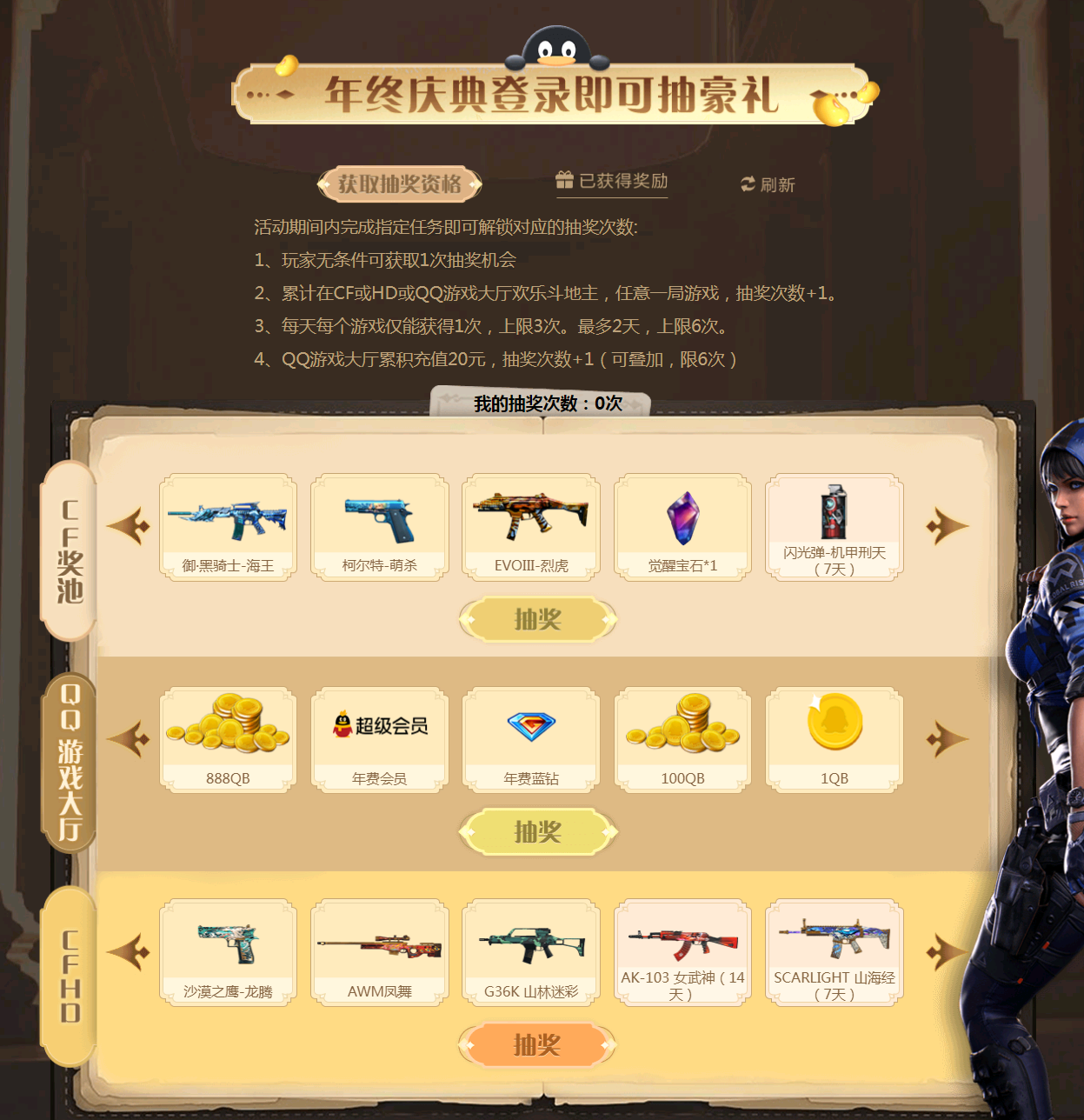 CF周年庆联合夺宝抽QB 超会 蓝钻 游戏武器等,完成任务可获取抽奖机会,有兴趣的可以去参与下。